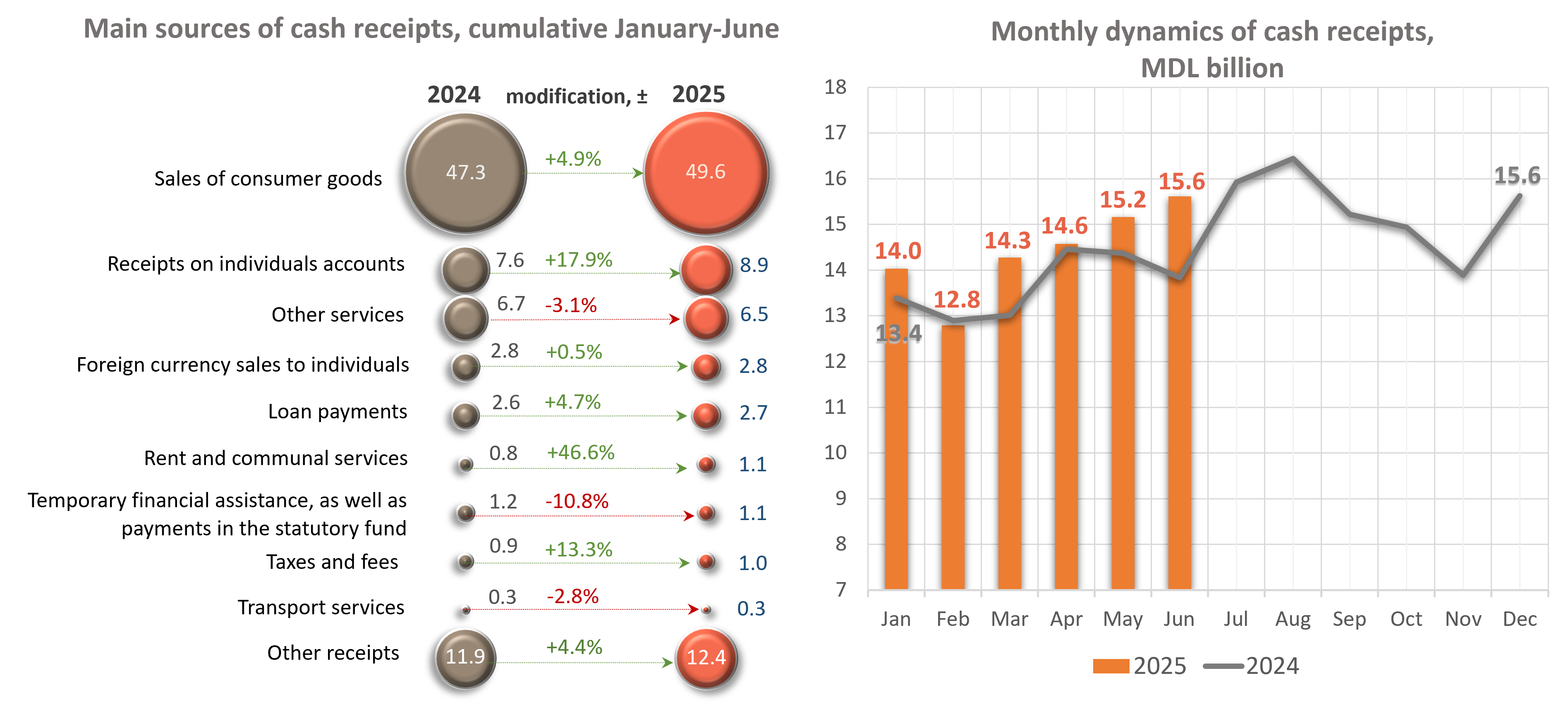 The volume of cumulative cash receipts in January-June 2025 increased by MDL 4,473.9 million (+5.5%) compared to the similar period of the previous year and amounted to MDL 86,450.4 million.