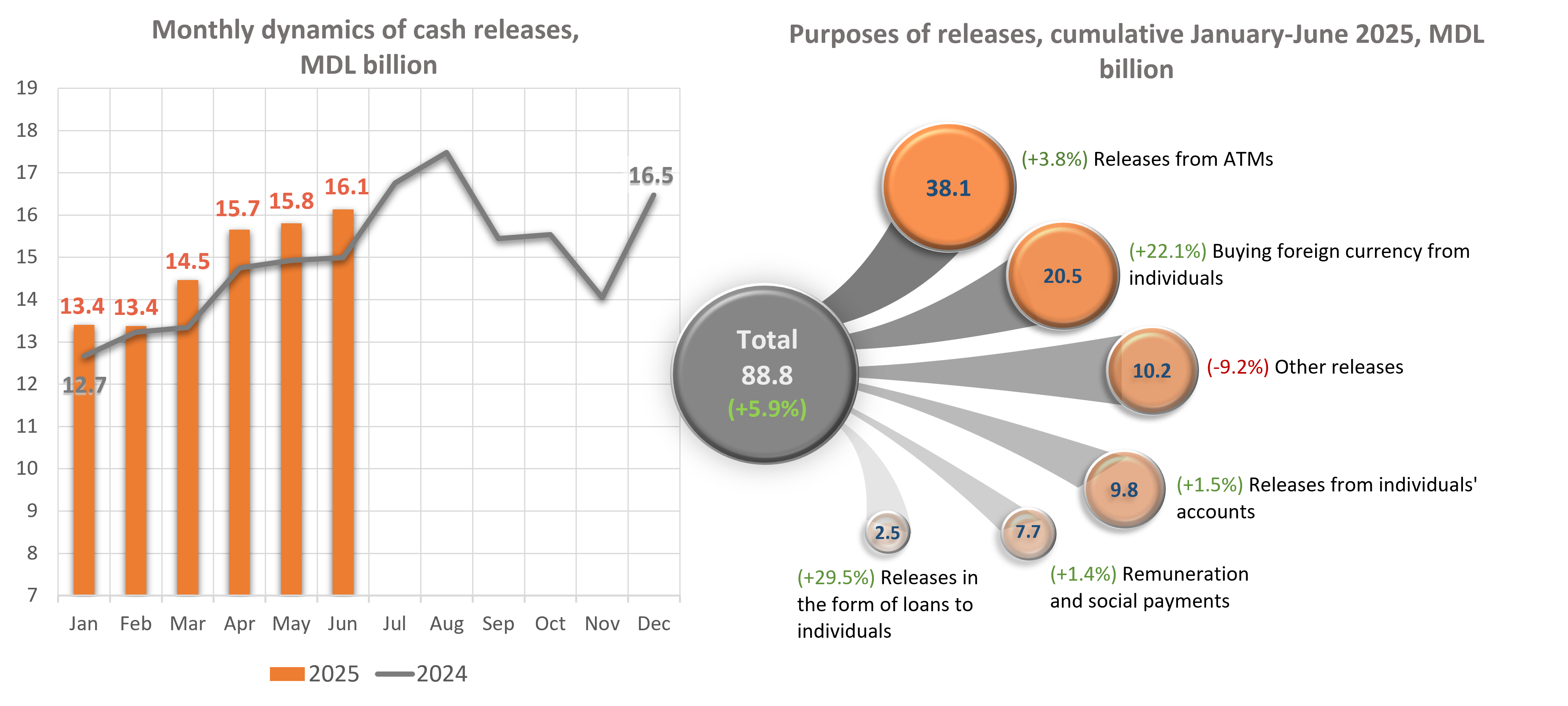 The volume of cumulative cash releases from bank vaults in January-June 2025 increased by MDL 4,928.9 million (+5.9%) compared to the same period of the previous year and amounted to MDL 88,834.3 million (Chart 2).