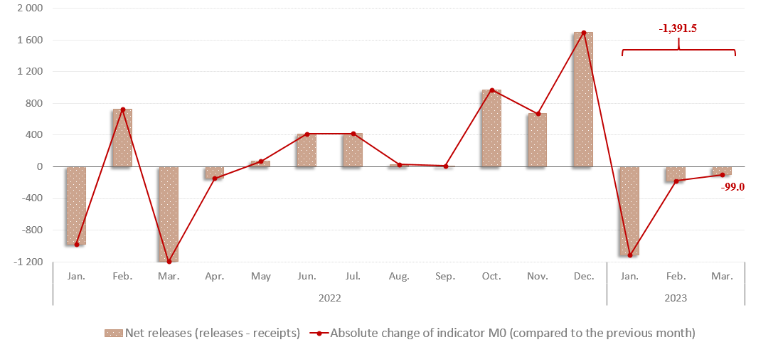 In March 2023, the currency in circulation (M0)1 amounted to MDL 33,014.5 million, decreasing by MDL 1,391.5 million (-4.0%) compared to December 2022 (Chart 1) due to decreasing volume of cumulative releases over the volume of cumulative receipts per banking system2 by MDL 1,391.4 million in January – March 2023.
