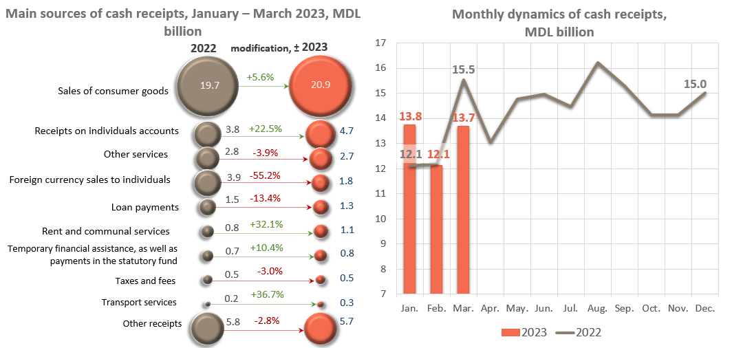 In January – March 2023, the volume of cash receipts decreased by MDL 274.6 million (-0.7%) compared to the same period of the previous year and amounted to MDL 39,555.1 million.