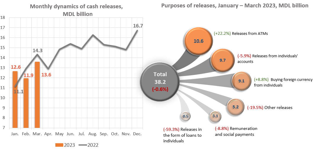At the same time, in January – March 2023 ATM withdrawals increased by MDL 1,921.3 million (+22.2%) compared to the same period of the previous year, which amounted to MDL 10,561.4 million, accounting for 27.7% of the total volume of cash withdrawals. There was also a significant increase of MDL 735.9 million (+8.8%) in the volume of cash released for the purchase of foreign currency from individuals, which amounted to MDL 9,140.0 million (equivalent to USD6 485.0 million), accounting for 23.9% of the total volume of cash releases.