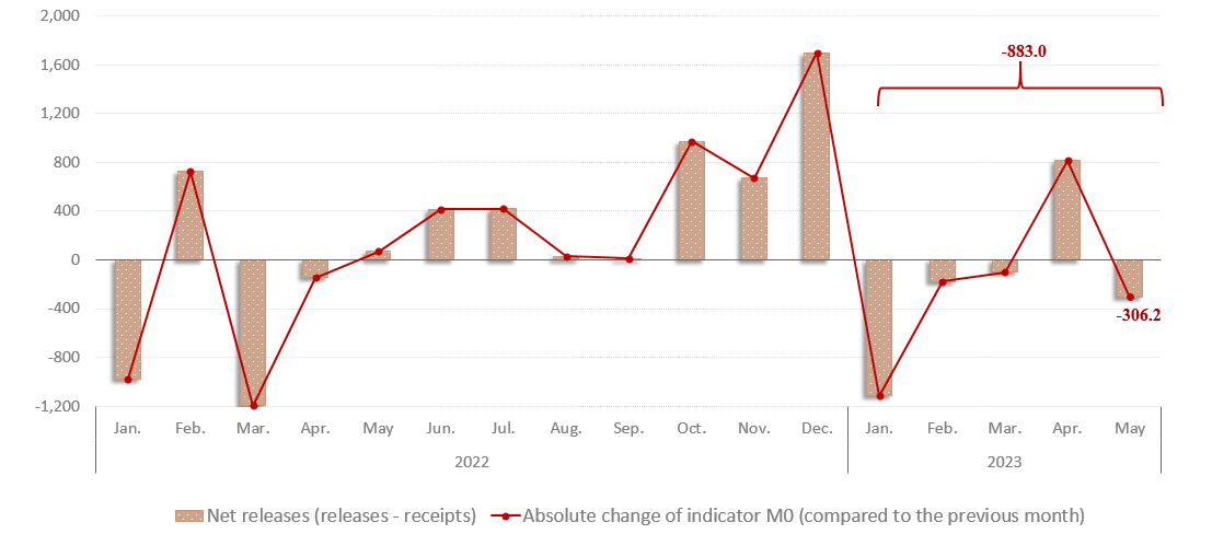 In May 2023, money supply M01 (currency in circulation) amounted to MDL 33,523.0 million, decreasing by MDL 883.0 million (-2.6%) compared to December 2022 (Chart 1) due to decreasing volume of cumulative releases over the volume of cumulative receipts per banking system2 by MDL 882.9 million in January – May 2023.