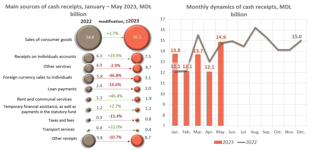 In January - May 2023, the volume of cash receipts decreased by MDL 1,139.4 million (-1.7%) compared to the same period of the previous year and amounted to MDL 66,496.4 million.