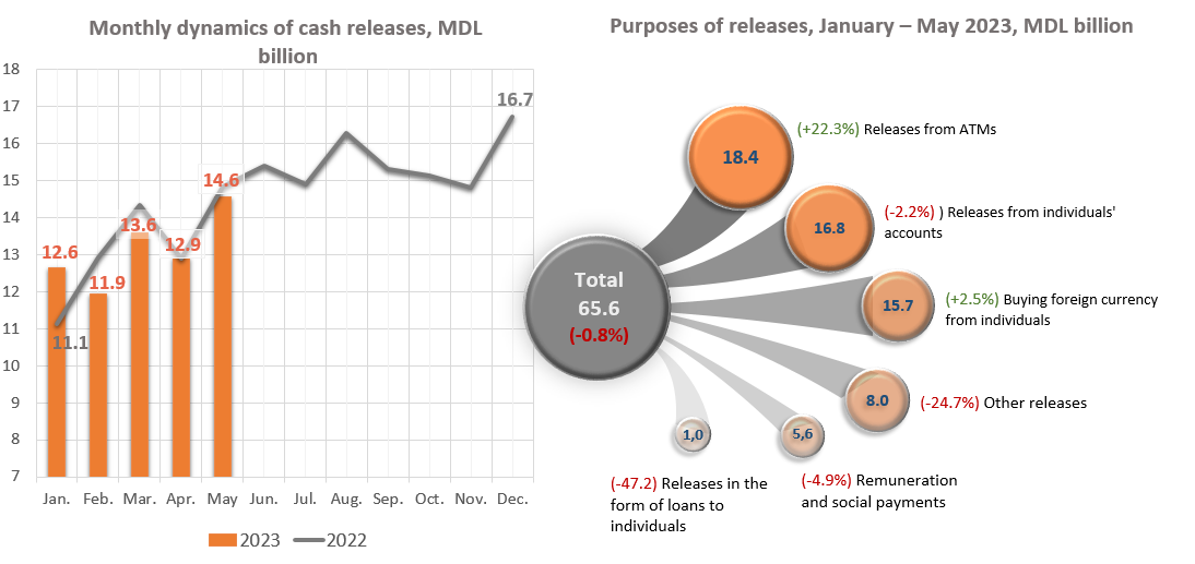 At the same time, in January - May 2023 ATM withdrawals increased by MDL 3,357.9 million (+22.3%) compared to the same period of the previous year, which amounted to MDL 18,411.1 million, accounting for 28.1% of the total volume of cash withdrawals. There was also a significant increase of MDL 381.0 million (+2.5%) in the volume of cash released for the purchase of foreign currency from individuals, which amounted to MDL 15,715.1 million (equivalent to USD6 850.0 million), accounting for 24.0% of the total volume of cash releases.