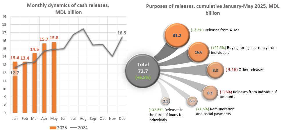 At the same time, in January-May 2025, there were recorded decreases in releases for other purposes by MDL 859.6 million (-9.4%) and in cash releases from individuals’ accounts by MDL 62.2 million (-0.8%).