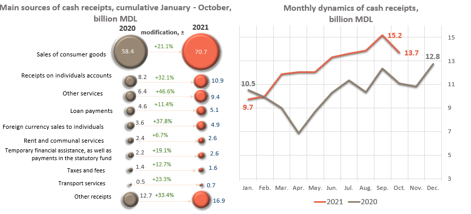 At the same time, in October 2021, the volume of receipts amounted MDL 13,704.6 million (-9.8% compared to September 2021 and +23.7% compared to October 2020).