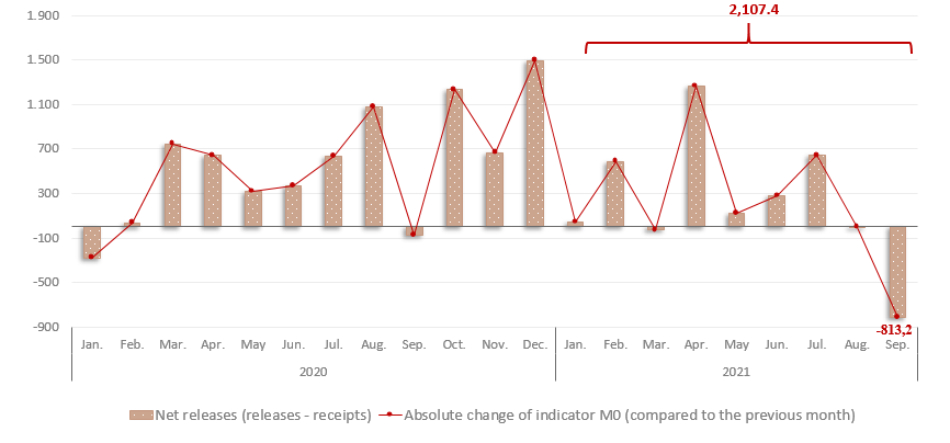 In September 2021, the currency in circulation (M0)1 amounted to MDL 31,926.3 million, increasing by MDL 2,107.4 million (7.1%) compared to December 2020 (chart no. 1) as a result of exceeding of the volume of cumulative releases over the volume of cumulative receipts per banking system by MDL 2,107.5 million2 in period January – September 2021.