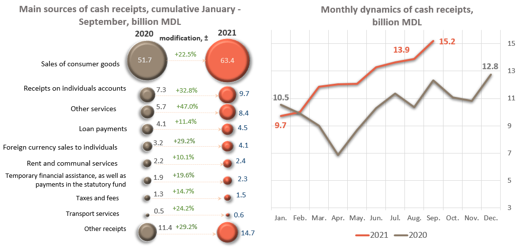 At the same time, in September 2021, the volume of receipts amounted MDL 15,189.7 million (+9.5% compared to August 2021 and +23.2% compared to September 2020).