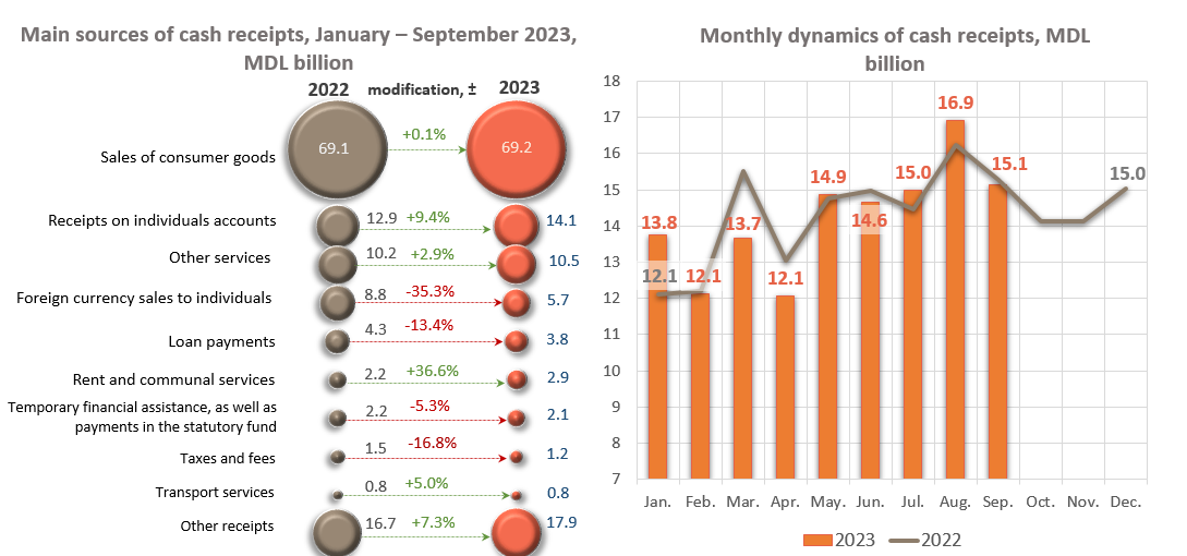 The volume of cumulative cash receipts in licensed banks in January – September 2023, decreased by MDL 382.4 million (-0.3%) compared to the same period of the last year and amounted to MDL 128,187.1 million.