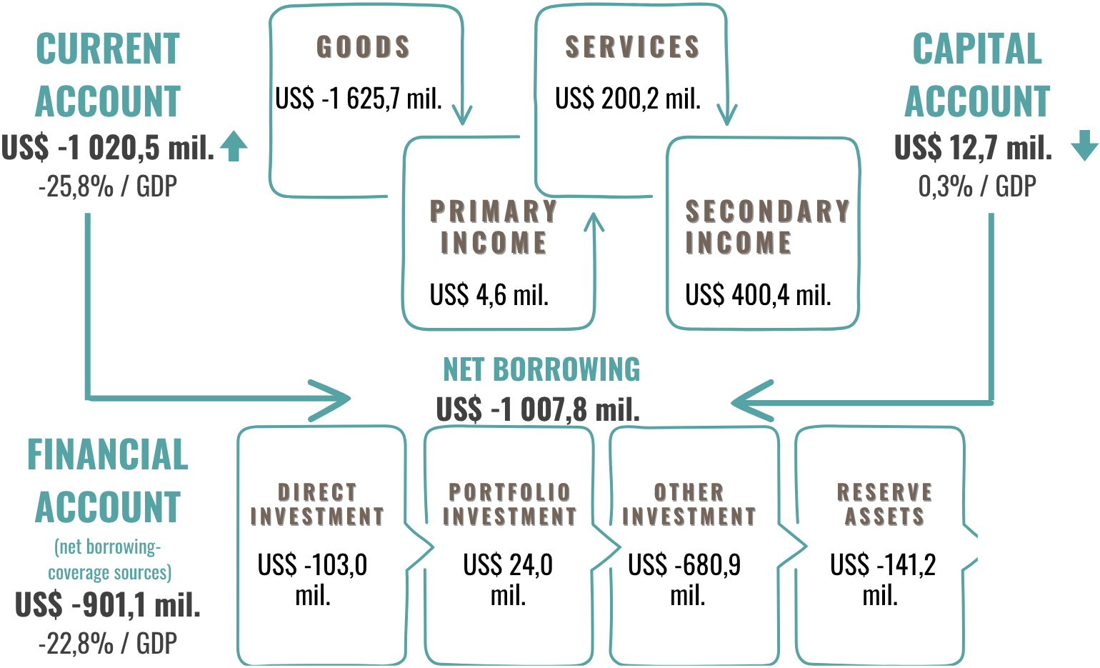 According to preliminary data, in Quarter I, 2025, the current account of the balance of payments recorded a deficit of - US$ -1 020,50 million and increased by 2,3 times as compared to the similar period of the previous year. The current account to GDP ratio amounted to -25,8%. The capital account recorded a positive balance amounting to US$ 12,74 million, and the financial account recorded a net inflow of US$ 901,07 million.