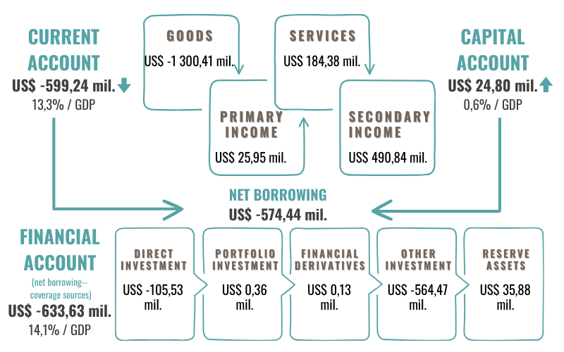 The capital account recorded a positive balance amounting to US$ 24,80 million, and the financial account recorded a net inflow of US$ 633,63 million.