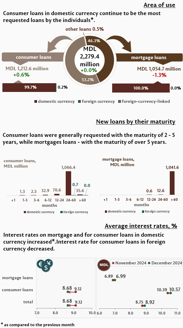 In December 2024, individuals contracted new loans (Infographic 2) in total amount of MDL 2,279.4 million, similar to the previous month, the largest share (53.2%) representing consumer loans. The largest part of consumer loans granted to individuals (MDL 1,066.4 million) was granted in domestic currency with a maturity ranging from 2 to 5 years.
