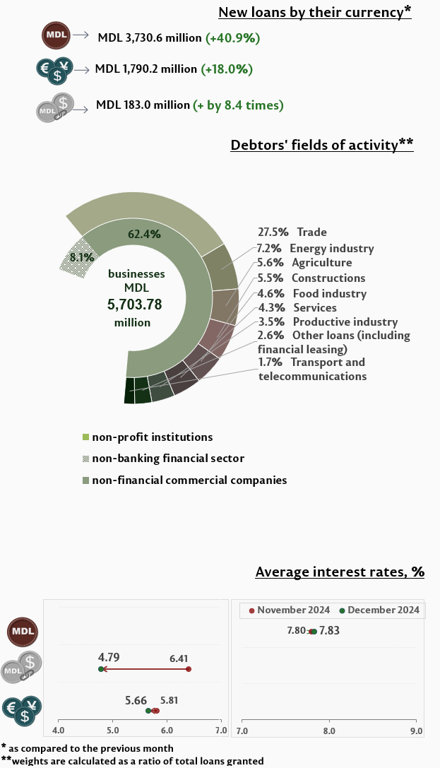 In December 2024, new granted loans1 (Infographic 1) amounted to MDL 8,096.4 million, increasing by 22.8% compared to November 2024. The largest share (75.6%) represents domestic currency loans, which totalled MDL 6,117.3 million, increasing by 21.1% as compared to the previous month.
