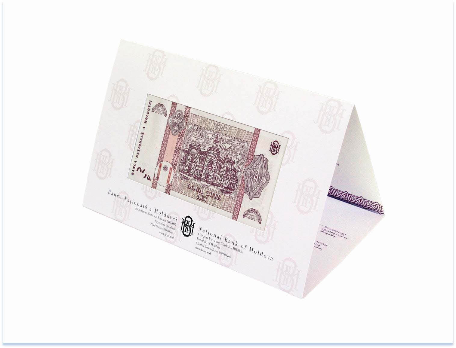 • See-through feature, On the blank right side of the banknote, the figure "200" is printed in the same place on the front and back side of the banknote, so that when viewed through the transparency and held against light, the entire figure is seen. Inside the circle within which the text „PE-UN PICIOR DE PLAI, PE-O GURA DE RAI... “ is printed, the outline of the pattern of the sun on the front side and of the crescent moon on the reverse side, as well as the circle of the sun and the circle within which the crescent moon is depicted, coincide perfectly when viewed through the transparency and held against light. The letter "V" on the front side and the Column of Trajan and the Infinite Column depicted on the reverse side combined together create a letter "M" (Moldova) when viewed through the transparency and held against light.