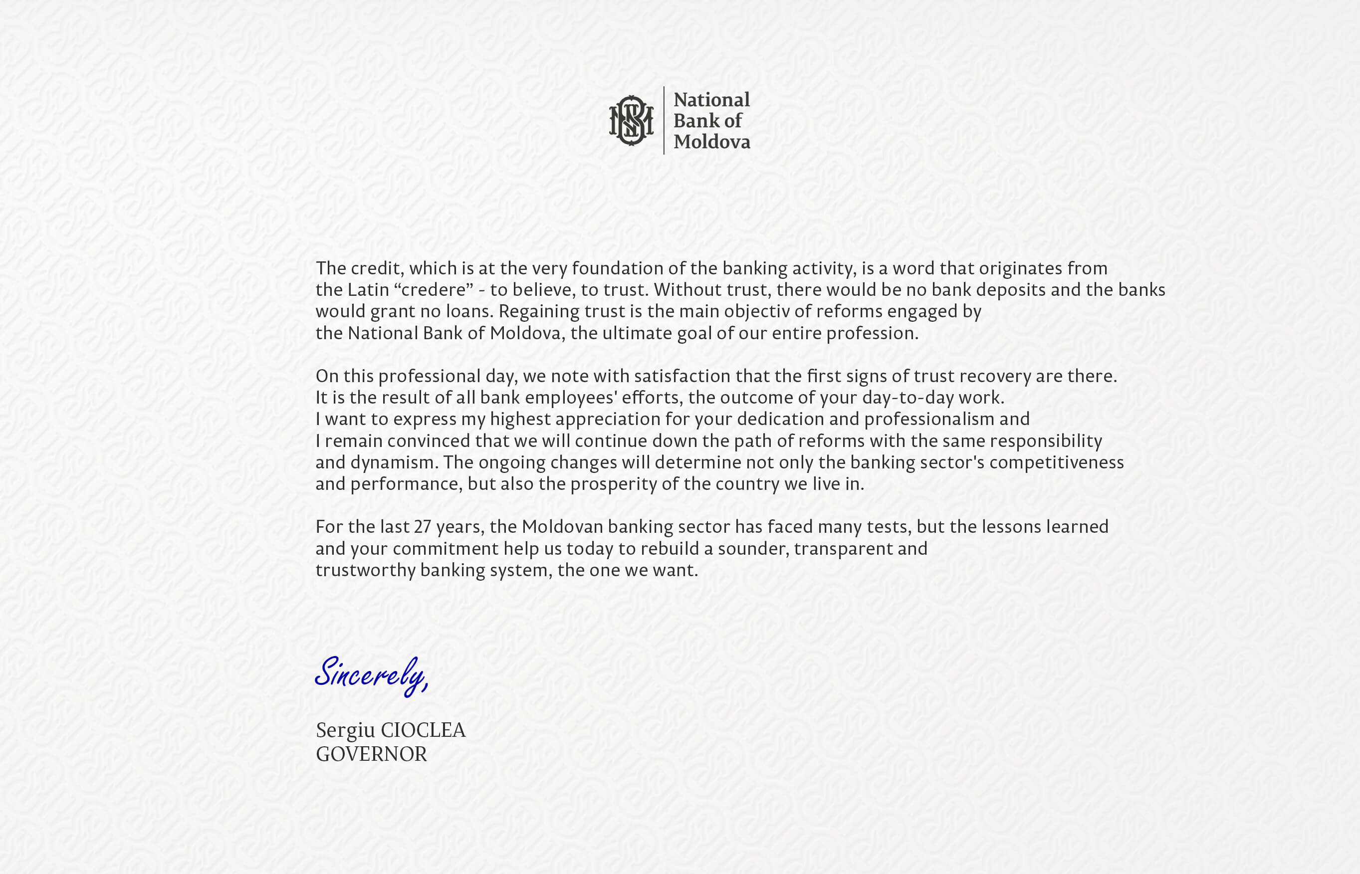 On this professional day, we note with satisfaction that the first signs of trust recovery are there. It is the result of all bank employees' efforts, the outcome of your day-to-day work. I want to express my highest appreciation for your dedication and professionalism and I remain convinced that we will continue down the path of reforms with the same responsibility and dynamism. The ongoing changes will determine not only the banking sector's competitiveness and performance, but also the prosperity of the country we live in.