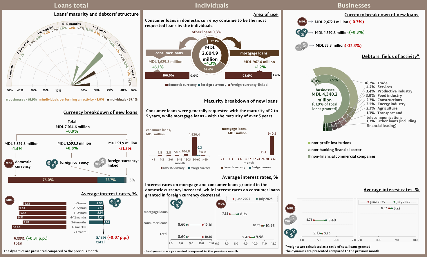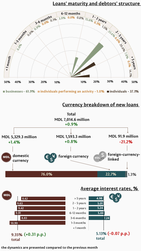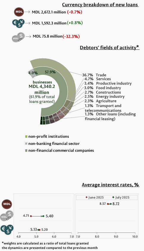 In July 2025, new granted loans1 amounted to MDL 7,014.6 million, increasing by 0.9% compared to the previous month (Infographic 1). 76.0% represents domestic currency loans, which totalled MDL 5,329.3 million, increasing by 1.4% as compared to June 2025.