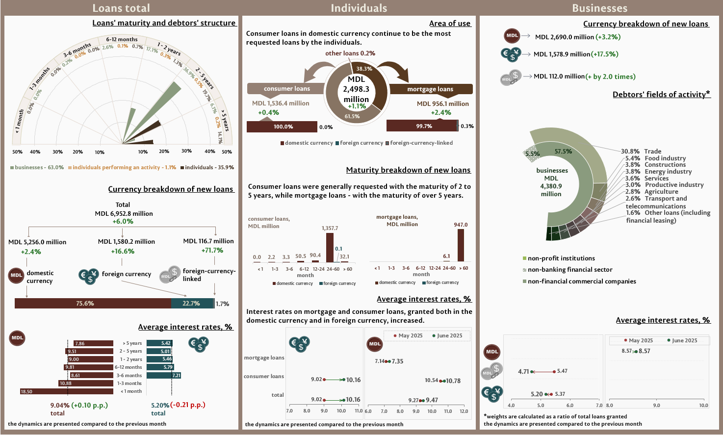 In June 2025, new granted loans1 amounted to MDL 6,952.8 million, increasing by 6.0% compared to May 2025 (Infographic 1). The largest share (75.6%) represents domestic currency loans, which totalled MDL 5,256.0 million, increasing by 2.4% as compared to the previous month.