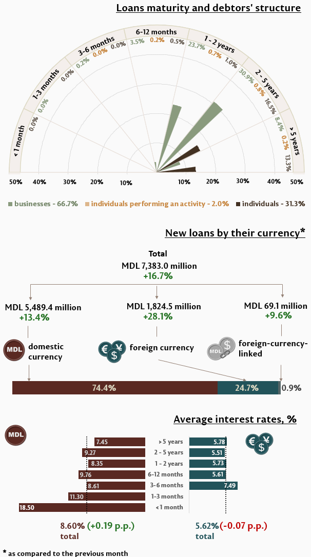 In March 2025, newly granted loans1 (Infographic 1) amounted to MDL 7,383.0 million, increasing by 16.7% compared to February 2025. The largest share (74.4%) represents domestic currency loans, which totalled MDL 5,489.4 million, increasing by 13.4% as compared to the previous month.