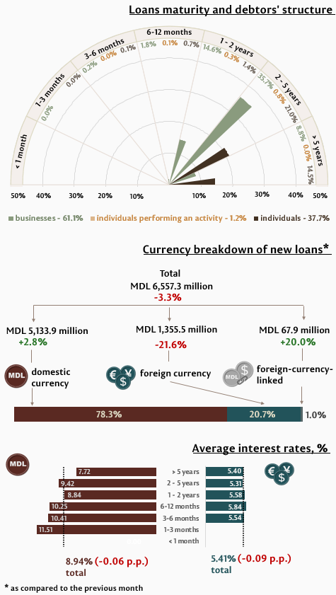 In May 2025, new granted loans1 (Infographic 1) amounted to MDL 6,557.3 million, decreasing by 3.3% compared to April 2025. The largest share (78.3%) represents domestic currency loans, which totalled MDL 5,133.9 million, increasing by 2.8% as compared to the previous month.