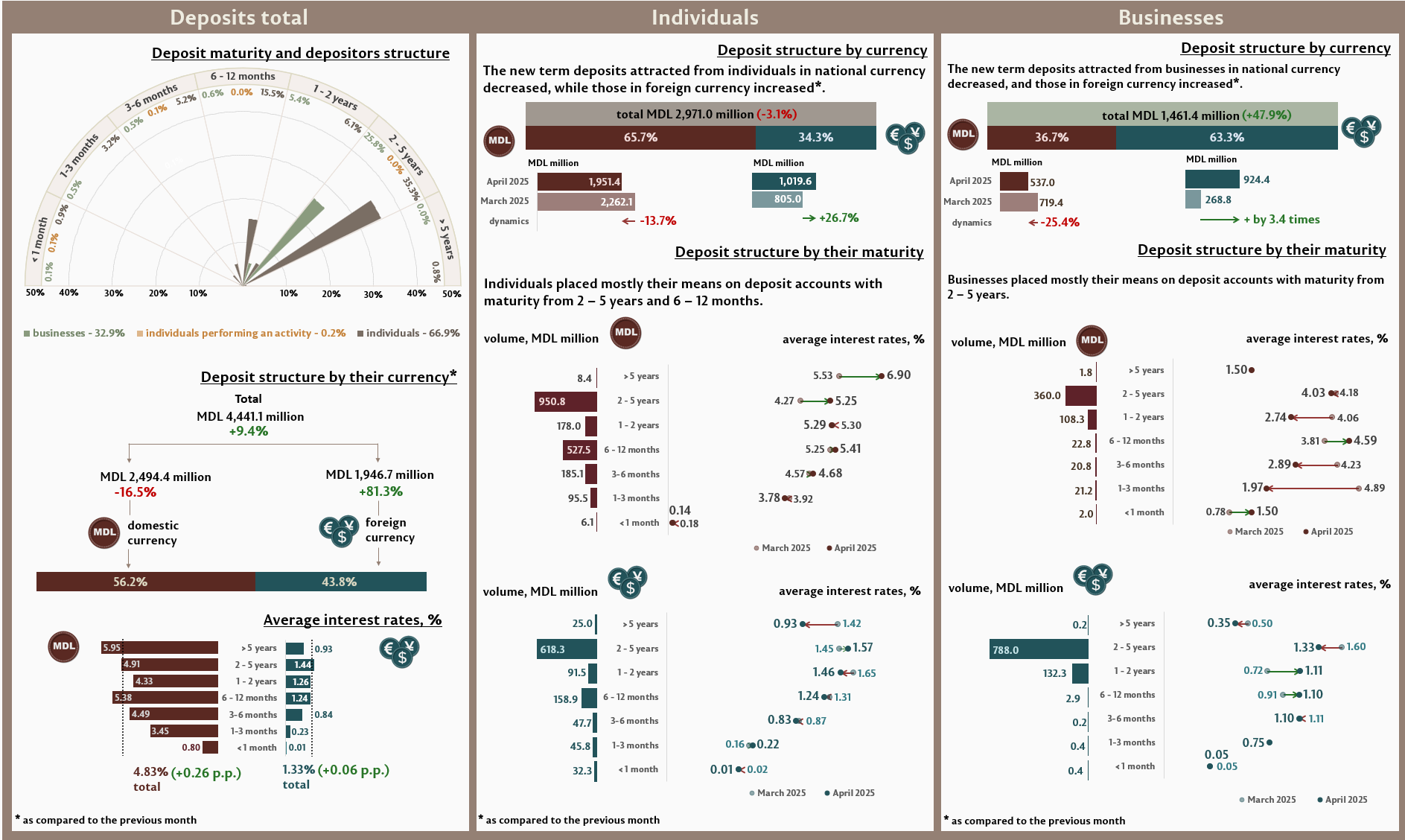 In April 2025, new term deposits attracted1 (Infographic 1) totalled MDL 4,441.1 million, increasing by 9.4% as compared to March 2025. Deposits attracted in domestic currency recorded a share of 56.2% and totalled MDL 2,494.4 million, decreasing by 16.5% compared to the previous month. Deposits attracted in foreign currency totalled MDL 1,946.7 million, being 81.3% lower than in the previous month.
