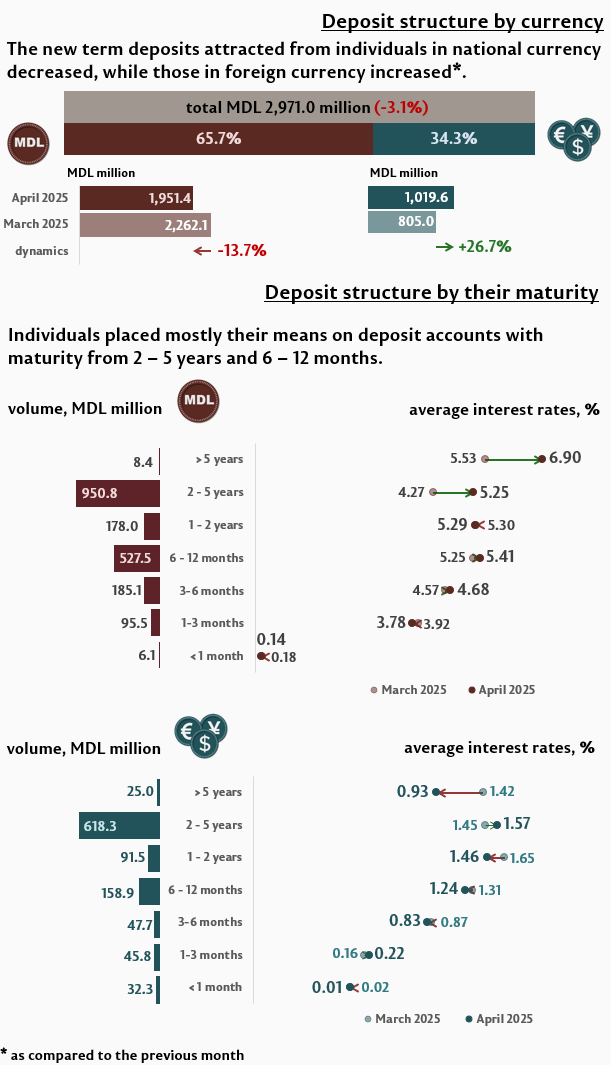 Individuals’ deposits amounted in April 2025 to MDL 2,971.0 million, decreasing by 3.1% compared to the previous month (Infographic 2). The most requested were deposits with terms from 2 to 5 years (52.8% of the total deposits of individuals) and deposits with maturities from 6 to 12 months (23.1%). Compared to April 2024, deposits in the national currency of individuals increased by 80.6%, while those in foreign currency increased by 36.6%.