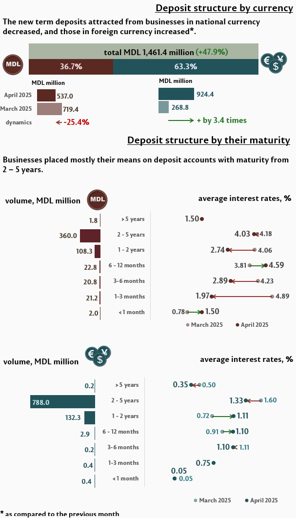 In April 2025, businesses’ deposits in domestic currency (Infographic 3) decreased by 25.4%, while those in foreign currency increased by 3.4 times, compared to the previous month. Businesses’ deposits in domestic currency amounted to MDL 537.0 million, while those in foreign currency – MDL 924.4 million. Compared to April 2024, deposits in domestic currency of businesses increased by 2.4%, while those in foreign currency increased by 3.5 times.