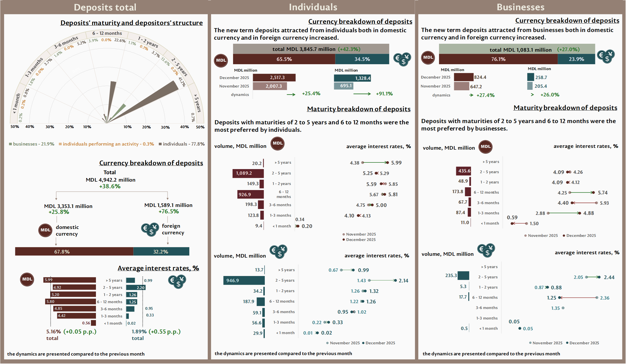 In December 2025, businesses’ new term deposits totalled MDL 1,083.1 million, increasing by 27.0% as compared to the previous month. Deposits in domestic currency amounted to MDL 824.4 million (+27.4%), while those in foreign currency – MDL 258.7 million (+26.0%). Compared to December 2024, businesses’ deposits in domestic currency decreased by 47.3%, while their deposits in foreign currency decreased by 45.1%.