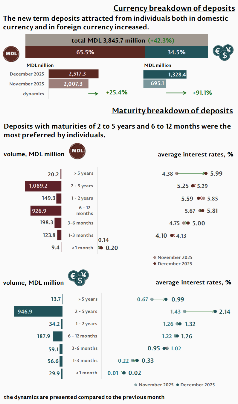 In December 2025, individuals’ deposits amounted to MDL 3,845.7 million, increasing by 42.3% as compared to the previous month (Infographic 2). Deposits with maturities of 2 to 5 years and 6 to 12 months were the most preferred, representing 52.9% and 29.0% of individuals’ total deposits, respectively. Compared to December 2024, individuals’ deposits in domestic currency increased by 11.9%, while those in foreign currency decreased by 22.2%.