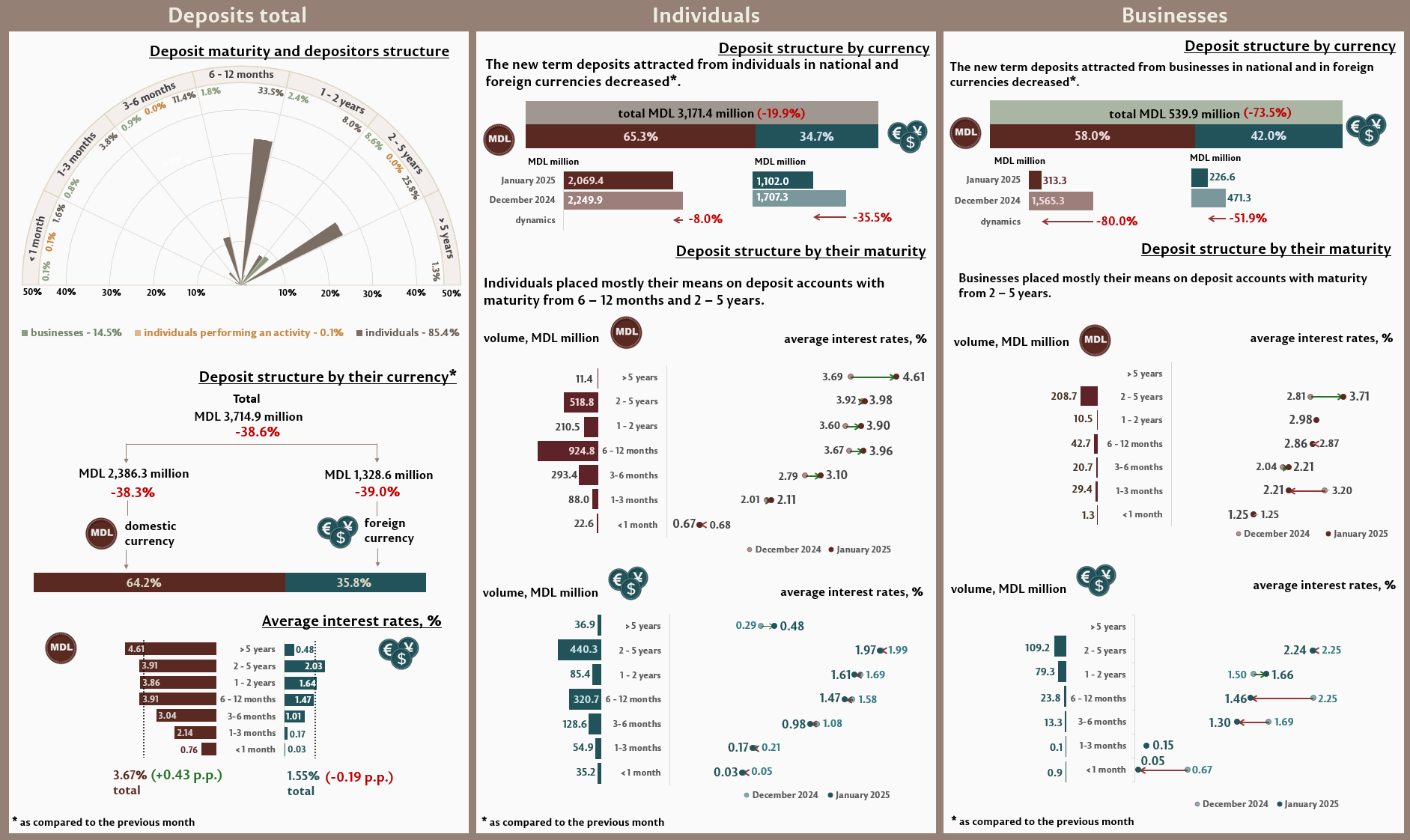 In January 2025, businesses’ deposits in domestic currency (Infographic 3) decreased significantly by 80.0%, while those in foreign currency decreased by 51.9%, as compared to the previous month. Businesses’ deposits in domestic currency amounted to MDL 313.3 million, while those in foreign currency – MDL 226.6 million. Compared to January 2024, deposits in the national currency of businesses decreased by 60.7%, while those in foreign currency increased by 30.1%.