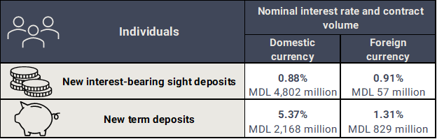 New deposits1 attracted in January 2026 amounted to MDL 24,746 million, with 68.2% placed by the businesses and individuals engaged in economic activities and 31.8% by individuals. The volume of new contracts with the businesses and individuals engaged in economic activities and the nominal interest rates are presented in the table below.