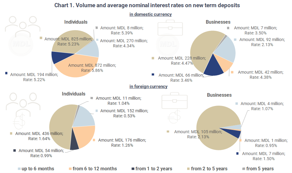 Deposits in domestic currency attracted in January 2026 remained the main form of savings - with term deposits in MDL representing 73% of total term deposits. The volume of new term deposits and the nominal interest rates, by currency, are reflected in Chart 1.
