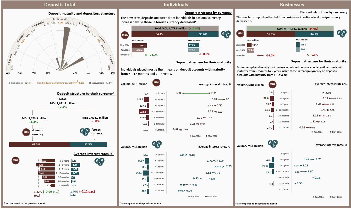 Individuals’ deposits amounted in May 2024 to MDL 2,078.8 million, increasing by 13.8% as compared to the previous month (Infographic 2). The most requested were deposits with terms from 6 to 12 months, which held a share of 42.0% of the total deposits of individuals.