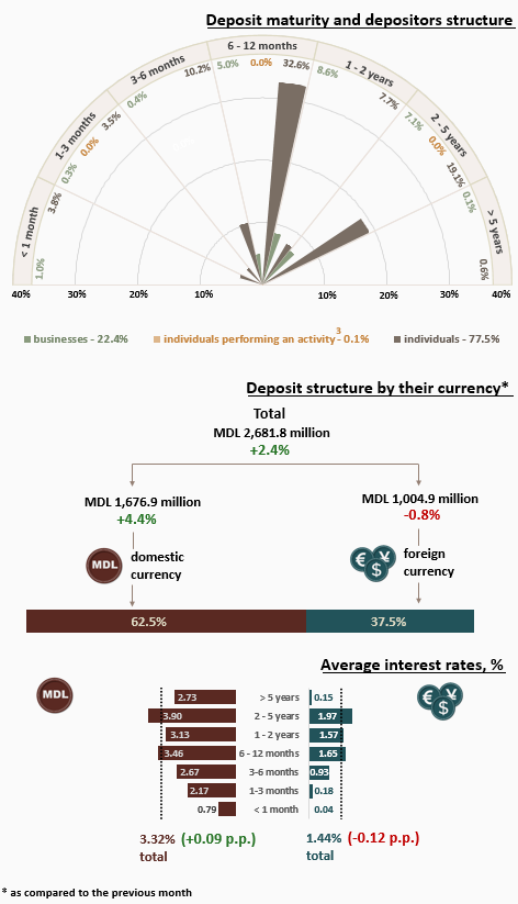 The average interest rate on deposits attracted in domestic currency from individuals increased by 0.15 percentage points as compared to the previous month, reaching 3.48%. At the same time, the average interest rate on foreign currency deposits decreased by 0.15 percentage points to the value of 1.35%.