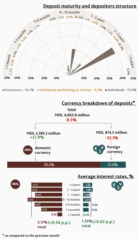 New term deposits attracted1 in May 2025 totalled MDL 4,063.8 million, decreasing by 8.5% as compared to April 2025 (Infographic 1). Deposits attracted in domestic currency recorded a share of 78.5% and totalled MDL 3,189.3 million, increasing by 27.9% as compared to the previous month. Deposits attracted in foreign currency totalled MDL 874.5 million, being 55.1% lower than in the previous month.