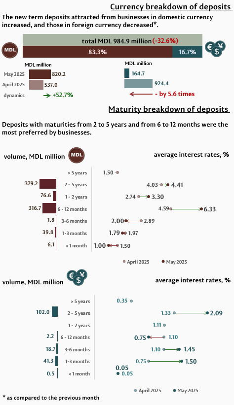 In May 2025, businesses’ deposits in domestic currency increased by 52.7%, while those in foreign currency decreased by 5.6 times, as compared to the previous month (Infographic 3). Businesses’ deposits in domestic currency amounted to MDL 820.2 million, while those in foreign currency totalled MDL 164.7 million. Compared to May 2024, businesses’ deposits in domestic currency increased by 2.4times, while their deposits in foreign currency decreased by 37.9%.