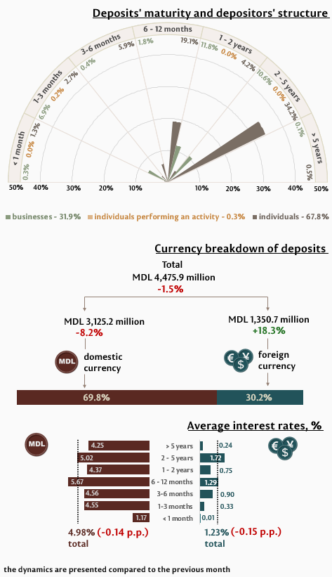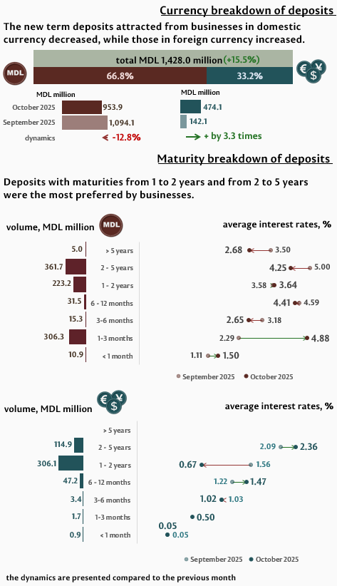 In October 2025, businesses’ new term deposits totalled MDL 1,428.0 million, increasing by 15.5% as compared to the previous month. Deposits in domestic currency amounted to MDL 953.9 million (-12.8%), while those in foreign currency – MDL 474.1 million (+ by 3.3 times). Compared to October 2024, businesses’ deposits in domestic currency increased by 15.7 %, while their deposits in foreign currency increased by 2.3 times.