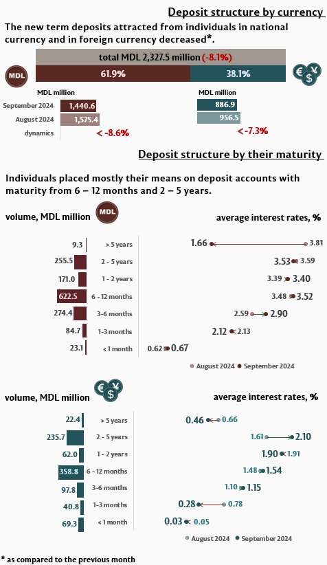 Individuals’ deposits amounted in September 2024 to MDL 2,327.5 million, decreasing by 8.1% as compared to the previous month (Infographic 2). The most requested were deposits with terms from 6 to 12 months (42.2%) and deposits with maturities from 2 to 5 years (21.1%) of the total deposits of individuals.