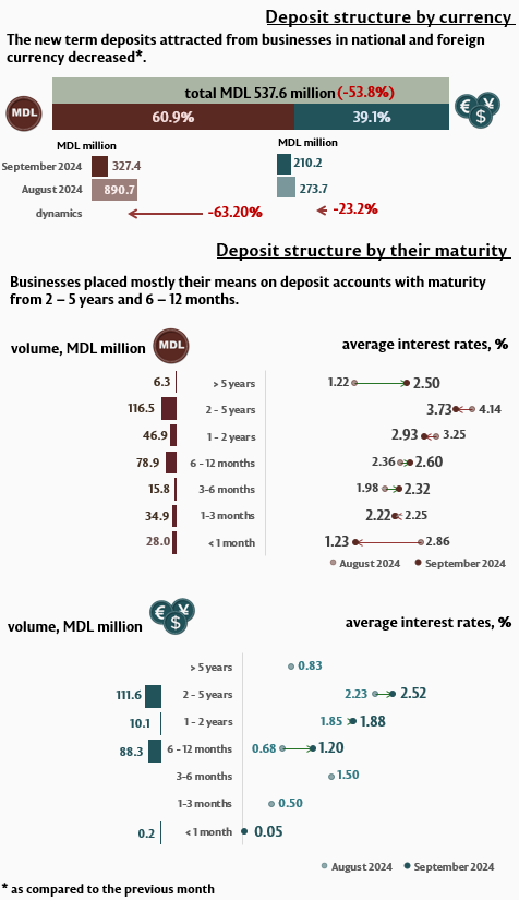 In September 2024, businesses’ deposits in domestic currency decreased by 63,2% (Infographic 3), while those in foreign currency by 23.2%, as compared to the previous month. Businesses’ deposits in domestic currency amounted to MDL 327.4 million, while those in foreign currency – MDL 210.2 million.