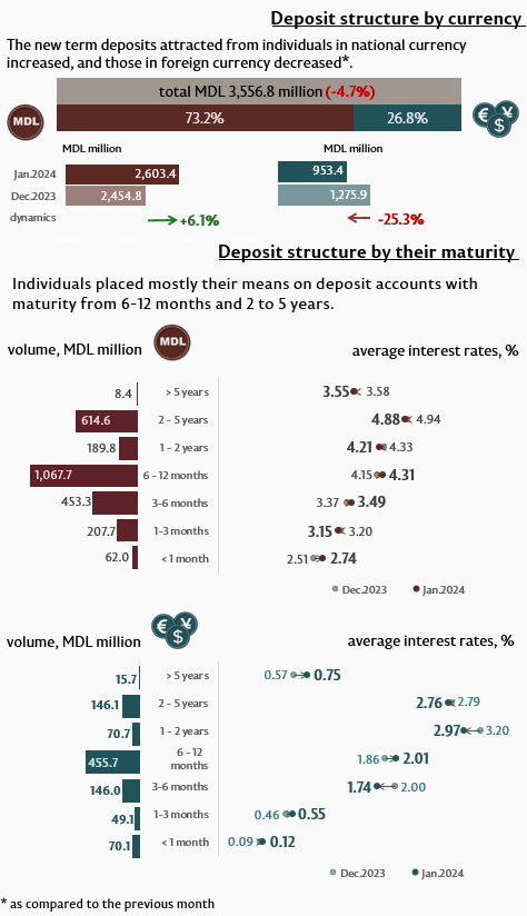 Individuals’ deposits amounted in January 2024 to MDL 3,556.8 million, decreasing by 4.7% as compared to the previous month (Infographic 2). The most requested were deposits with terms from 6 to 12 months, which accounted for 33.6% of the total deposits.