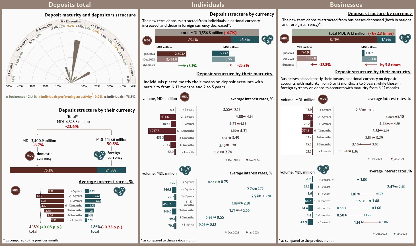 In January 2024, new term deposits attracted1 (Infographic 1) totalled MDL 4,528.5 million, decreasing by 23.6% as compared to December 2023. Deposits attracted in domestic currency recorded a major share of 75.1% and totalled MDL 3,400.9 million, decreasing by 6.7% as compared to the previous month. Deposits attracted in foreign currency totalled MDL 1,127.6 million, decreasing by 50.5 percent compared to the previous month.
