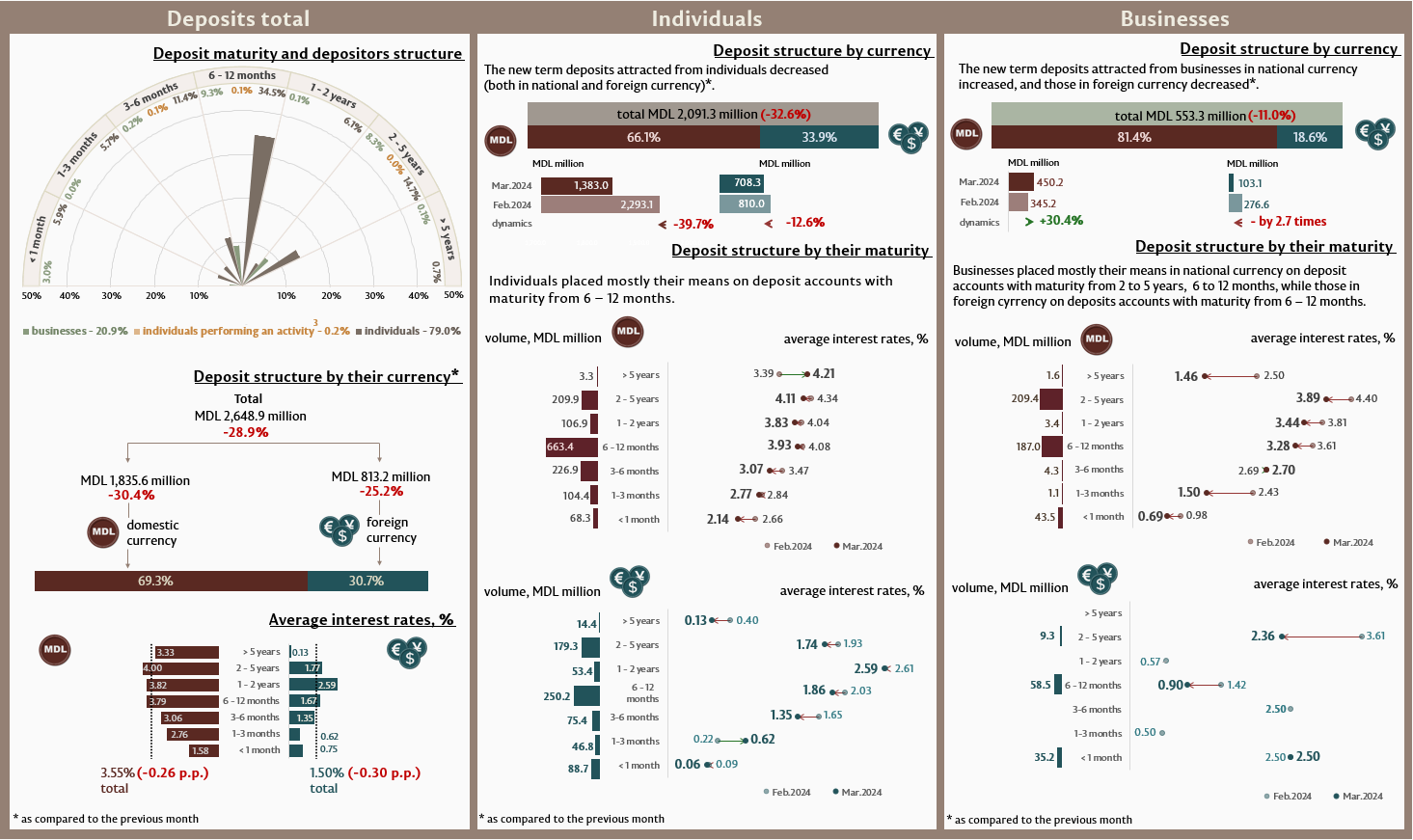 Individuals’ deposits amounted in March 2024 to MDL 2,091.3 million, decreasing by 32.6% as compared to the previous month (Infographic 2). The most requested were deposits with terms from 6 to 12 months, which accounted for 43.7% of the total deposits of individuals.