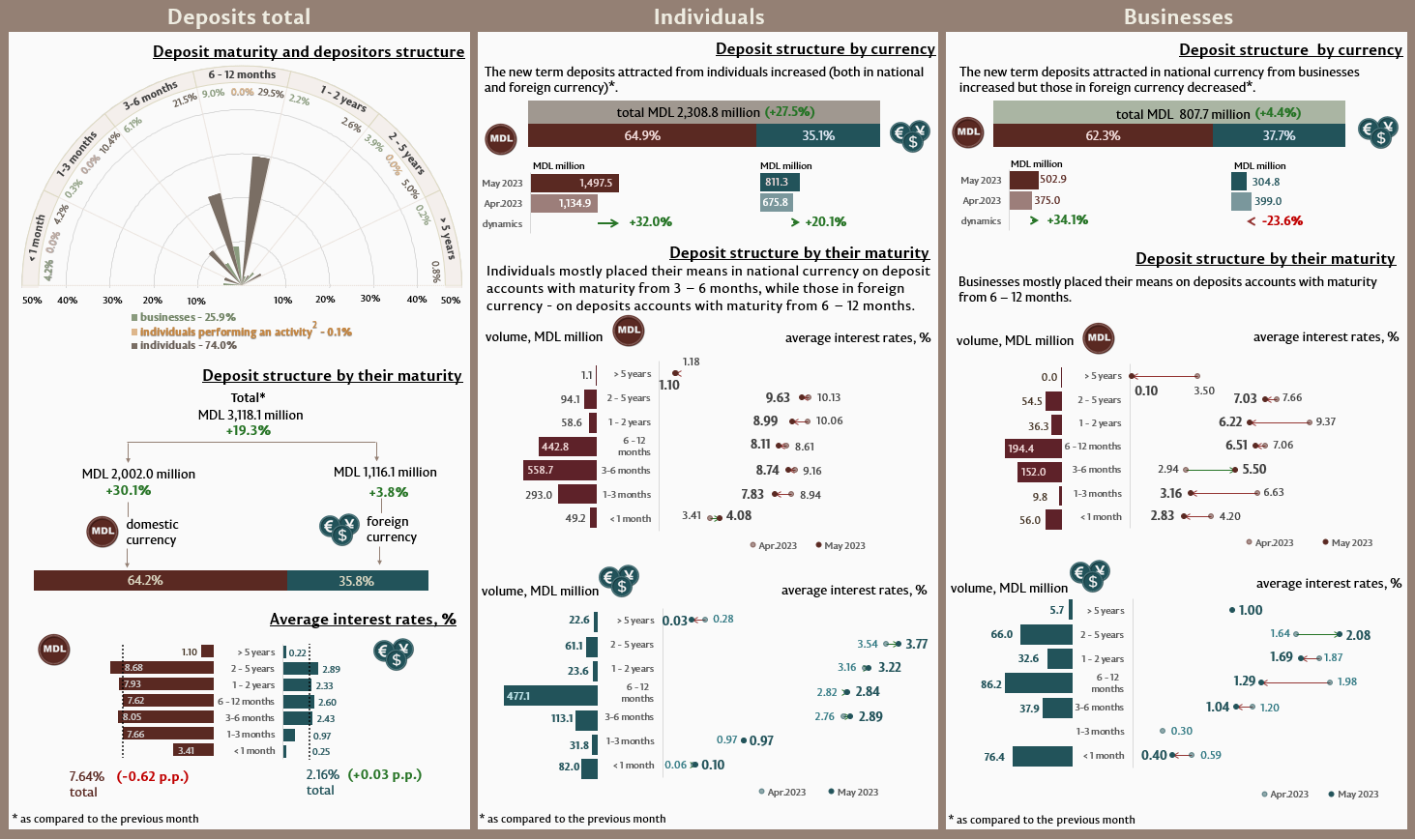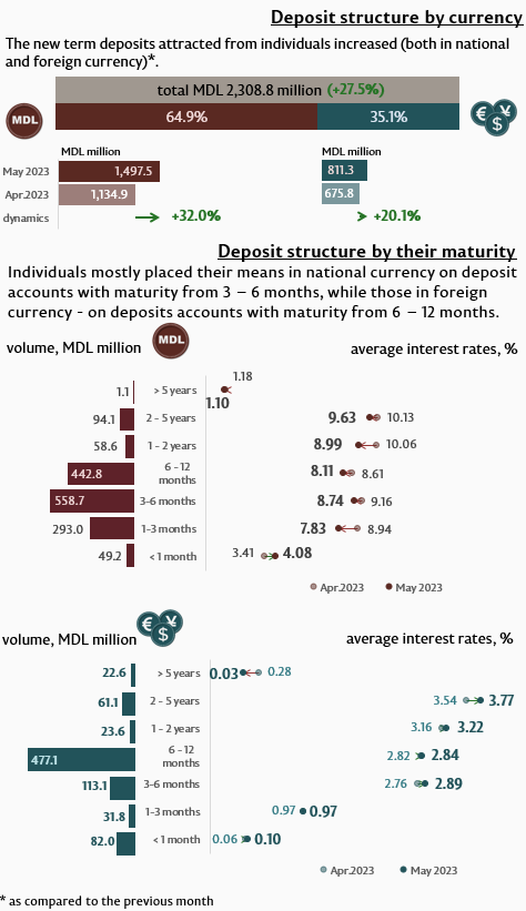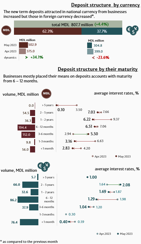 In May 2023, new term deposits attracted1 (Infographic 1) accounted for MDL 3,118.1 million, increasing by 19.3% as compared to April 2023. Deposits attracted in domestic currency recorded a major share of 64.2% and totalled MDL 2,002.0 million, increasing by 30.1% as compared to the previous month.