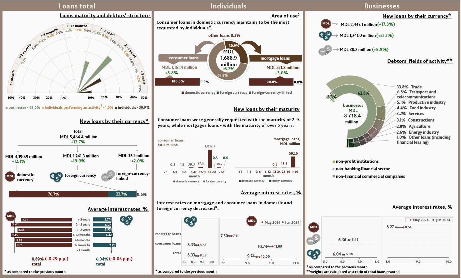 In June 2024, new loans extended1 (Infographic 1) amounted to MDL 5,464.4 million, increasing by 13.7% compared to May 2024. The largest share (76.7%) represents domestic currency loans, which tot alled MDL 4,190.9 million, increasing by 12.1% as compared to the previous month.
