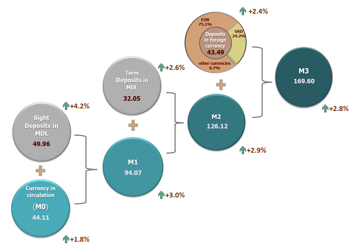 5. Money supply M2 includes money aggregate (M1), term deposits in Moldovan lei of residents and money market instruments.