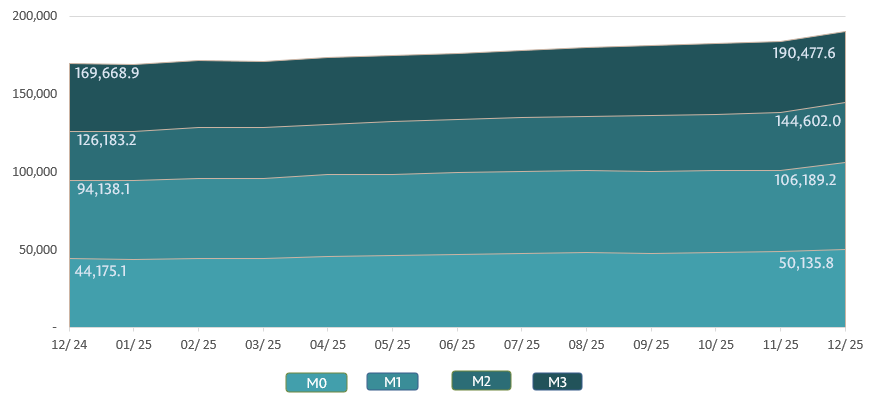 Money supply M25 amounted to MDL 144,602.0 million, increasing by 4.5% compared to November 2025 and by 14.6% compared to the same period of the previous year (Chart 2).