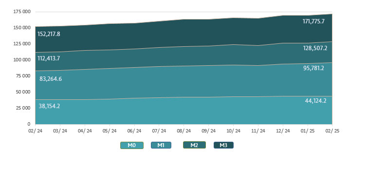 Money supply M25 increased by MDL 2,271.4 million or by 1.8% compared to January 2025 and amounted to MDL 128,507.2 million, being 14.3% higher than in the similar period of the previous year (Chart 2).