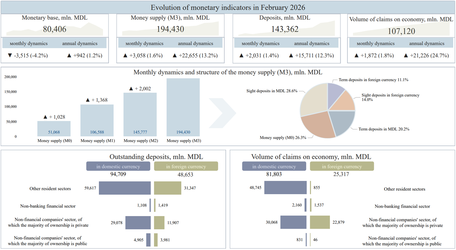 In February 2026 the monetary base1 amounted to MDL 80,406 million, which represents a decrease by 4.2% compared to January 2026.