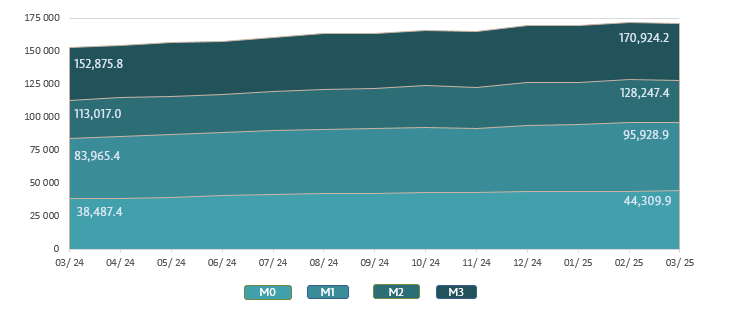 Money supply M25 decreased by MDL 259.9 million or by 0.2% compared to February 2025 and amounted to MDL 128,247.4 million, being 13.5% higher than in the similar period of the previous year (Chart 2).