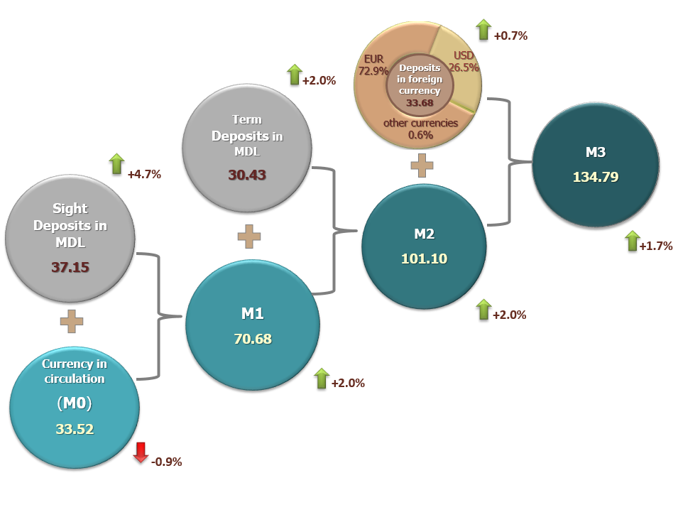 5. Money supply M2 includes money aggregate (M1), term deposits in Moldovan lei of residents and money market instruments.