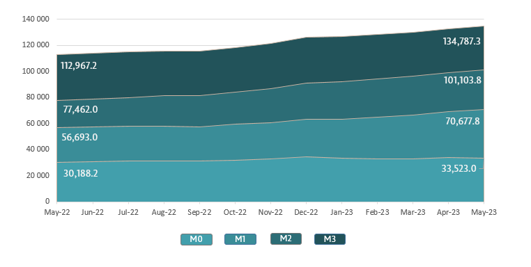 Money supply M36 increased by MDL 2,195.4 million (+1.7%) compared to April 2023 and accounted for MDL 134,787.3 million, by 19.3% higher than in the similar period of the previous year.